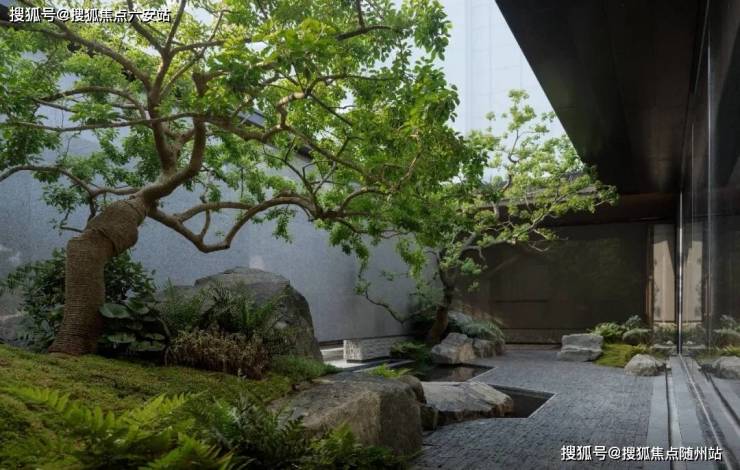 设计师在天井内以乌桕、造型景石作主景,以红盖鳞毛蕨、青苔等作小景,营造出古朴自然、静谧禅意的氛围。