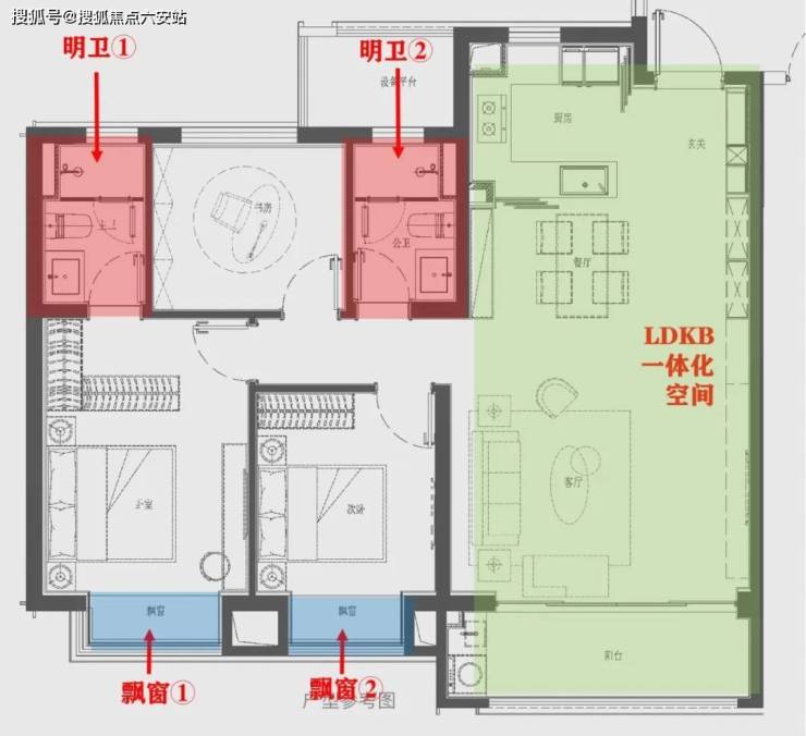其次都采用了经典LDKB一体化空间设计,让客餐厨空间共处同一个开放空间,构成家的核心区域,增近家庭成员的日常生活交流。
