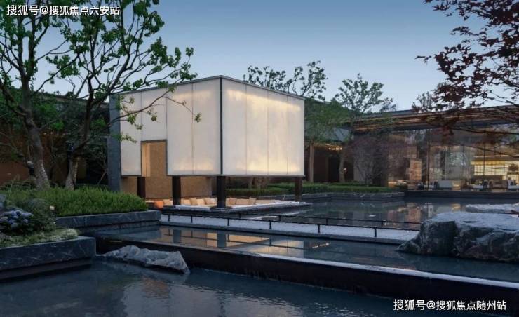 山水隐园设计灵感来源于“元四家”倪瓒的《江亭山色图》,设计师以石为纸、以水为墨,把 “淡烟流水画屏幽”之境融入场景,将坡岸、古树、空亭、静水以现代简约的方式呈现出来。