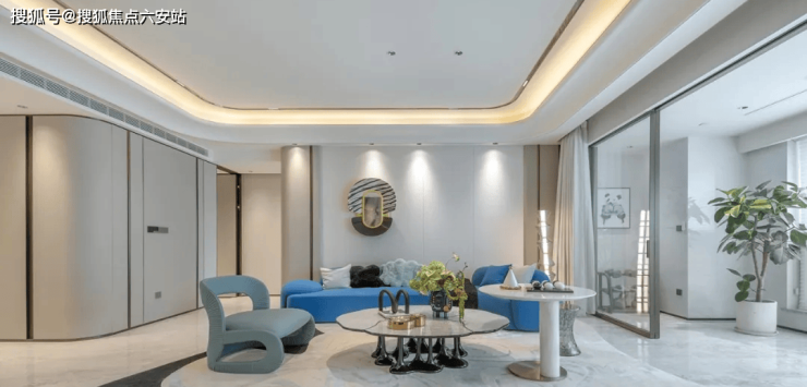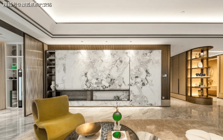 室内空间则以“全球奢石博物馆”为理念,芬迪白、喜马拉雅灰、雪山蓝等20余种进口名石贯穿全屋,主卧吊顶融入弧形波浪元素,营造“复古与摩登共生”的沉浸式艺术体验。