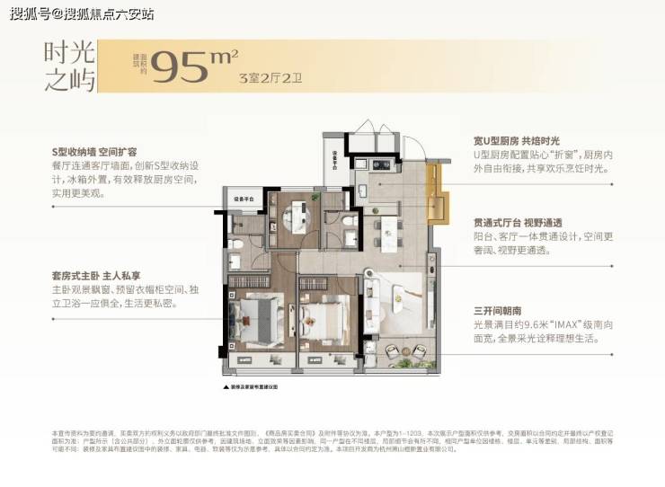 🔹 建面约95㎡ 三房两厅两卫(刚需首选):户型方正,三开间朝南,面宽约9.6米,采光充足。创新“S墙”设计,冰箱内嵌不占厨房空间,厨房采用U型动线,提升烹饪效率;两个卫生间均做干湿分离,便于打扫;南向阳台与餐客厅相连,空间更显通透,总价230万起,门槛亲民,轻松满足三口之家居住需求。