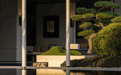 它框住的,是一座超300㎡的迎宾水院。水中摇曳着阵列的乔木,两岸是对称的连廊,扑面而来的仪式感,会让你想起新德里安缦酒店。