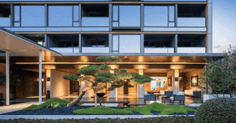 门前是同价位楼盘很少见的日本黑松,树龄有几十年。穿过主入口,迎接你的是美术馆般的巨幅玻璃框景。