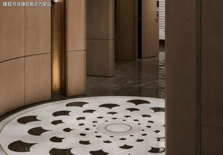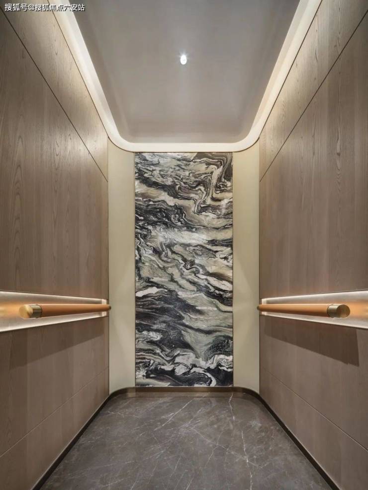 走出紫山水岩板的电梯轿厢,特别定制的银杏叶图纹双开装甲门,搭配玲珑抽象的“石”来运转艺术雕塑,立见开门见山的寓意,朴实稳重的精气神,传递富贵财运的美好意蕴。
