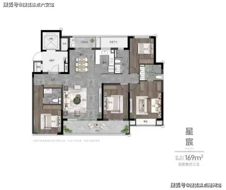 最后,我们来看看伟星·星润名著的尊享级户型,建面约169㎡四房两厅三卫户型。