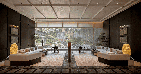 “以园纳景,以筑载道”,杭州保利西源赋从南宋画院的山水长卷中汲取灵感,在现代城市肌理中,重建人与自然的亲密对话。以建筑为媒介,将“西湖十景”的山水意境、人文精神与工艺美学熔铸一体。循着游廊徐徐展开的,不再是简单的功能分区,而是一幅流动的立体画卷——月门框景如断桥残雪般意境悠远,水庭倒影再现三潭印月的空灵,石材的肌理里藏着孤山烟云的记忆。这既是对南宋园林艺术的当代致敬,亦是对地域文化的深度解读。