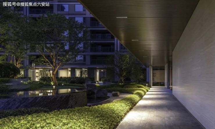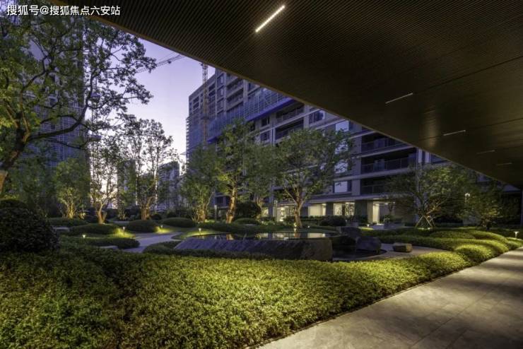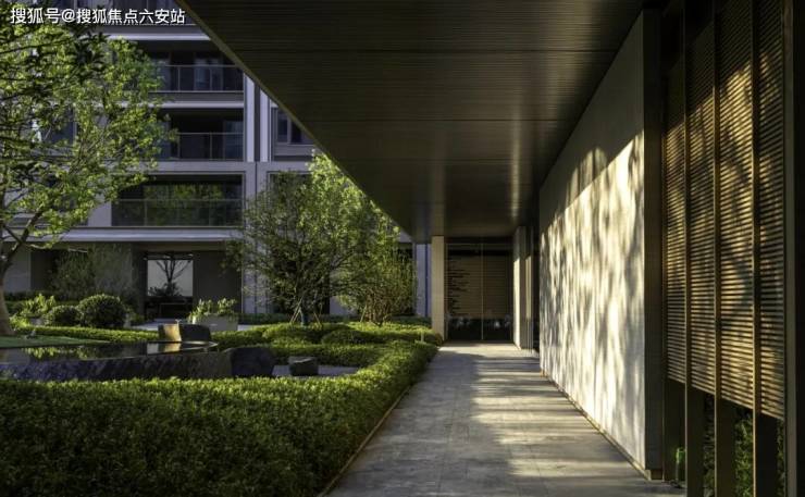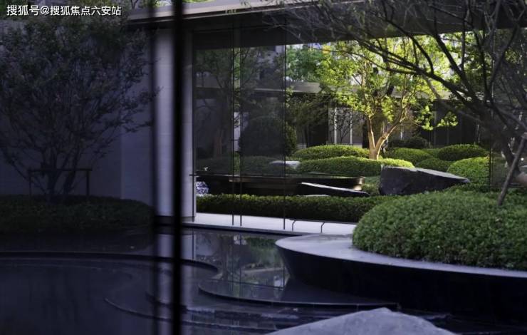从归家大堂到风雨连廊,再到架空层悦享花园,随公共向私隐层层递进的空间转换,以人性化关怀与丰富体验感,烘托出杭曜置地中心倍感尊崇的归家礼遇。一轴五进七景由此铺排而开,泉流踊跃、草木葳蕤、桥廊如画,城市喧嚣隔绝于外,山水真意糅融于内,将野奢乐趣一直延续到家门前。合理的平面布局打造出多层次的前场空间,几何线条从建筑延展到了景观中,项目未来将作为商办楼形式予以保留,介于开放与隐喻之间,留有一处雅致空间。