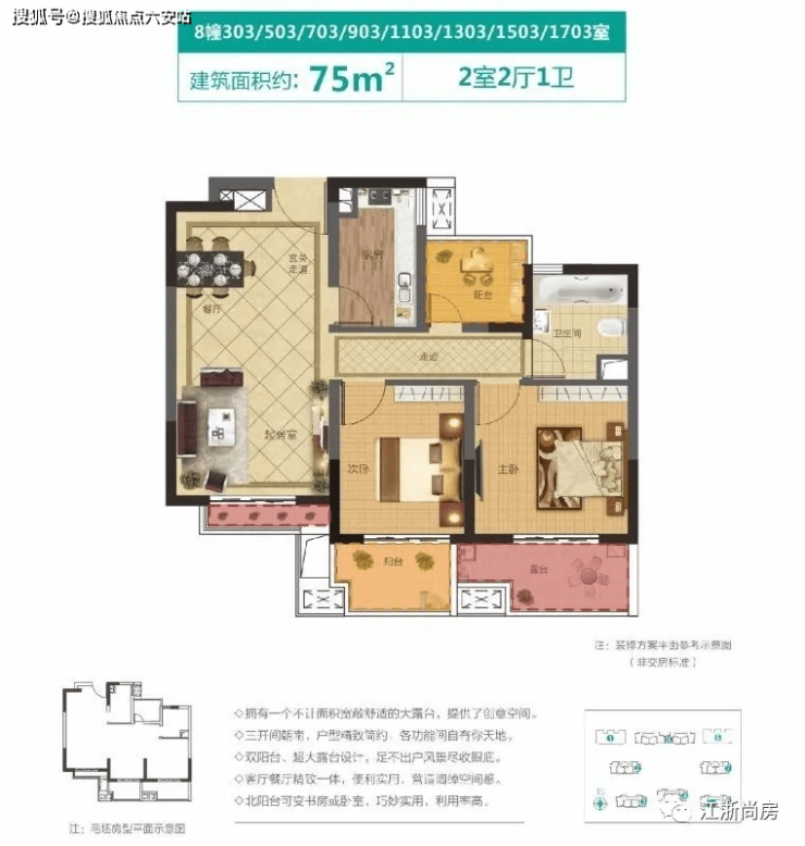 • 69㎡灵动两房:创新采用三开间朝南布局,独立玄关设计提升归家仪式感,实测使用面积达63㎡,得房率突破90%。嵌入式收纳系统与可变空间设计,满足年轻家庭三代同堂需求。