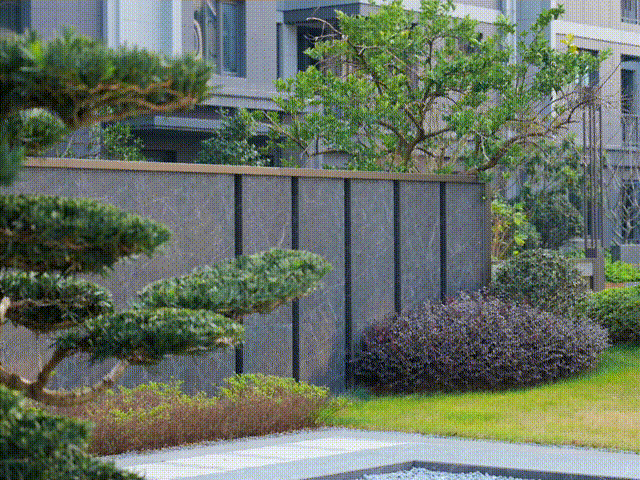 园林细节:水刀切割弧线铺装地面(费工费料保品质),树种选胸径大、冠幅宽品种(冬不遮阳夏遮阴),交付半年绿化仍如初。