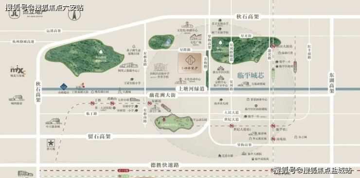1、【三山一水,四面皆景】临平山、皋亭山、丁山、上塘河环绕,山水与建筑围合,形成藏风聚气的灵秀宝地,四面满目皆景。