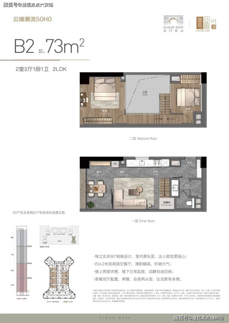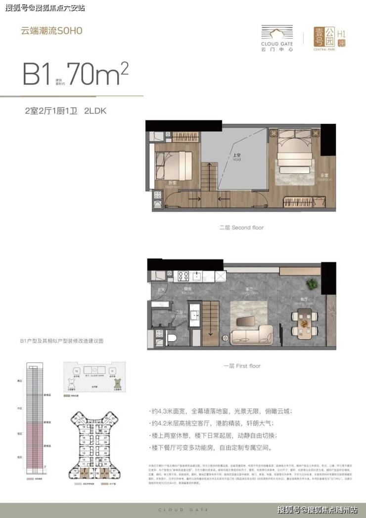 云门中心LOFT公寓的空间设计极具特色,约4.2米层高创新设计,打造出通透大气的空间感。产品设计充分考虑了空间利用的灵活性和功能性,如B1户型约70㎡两室两厅一厨一卫设计,约4.3米面宽,全幕墙落地窗,光景无限,可俯瞰云城;约4.2米层高挑空客厅,营造轩朗大气的空间感受。