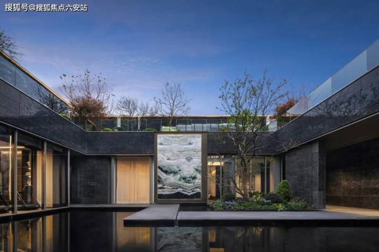 下沉庭院设计了⼤⾯积景观⽔⾯,寓意「引江⼊园」,并以纯粹⼲净的玻璃幕墙与爱尔兰绿奢⽯墙对景,营造出静谧、沉稳、祥和与空灵的氛围,希冀抚平闹市的喧嚣,实现「出则繁华、⼊则静谧」的生活场景。