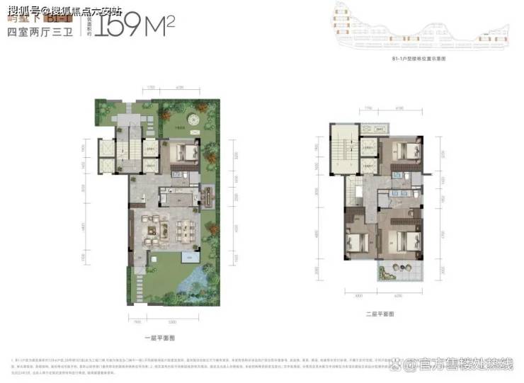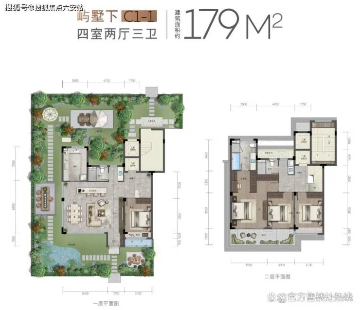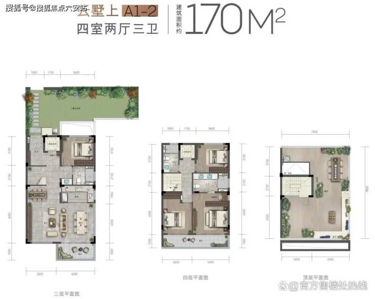 以主力约 179㎡上叠为例,四房三卫,三开间朝南,南向总面宽约 10 米,得房率达约 90%。三层餐客横厅直连超 30㎡的南向大露台,五层还有约 50㎡的超级大露台 。