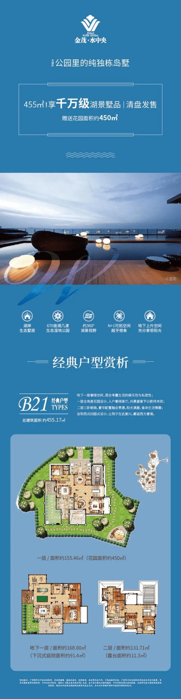 项目介绍:金茂·水中央度假中心,雄踞湖城较大生态公园—湘几漾公园核心区域,四面环水,独立成岛,拥享罕有的湖岸生态,且集旅游、休闲、商业、酒店、住宅于一体,堪为湖城高品质独栋别墅公园住区。作为精英人士的优选回归田园之地,金茂·水中央秉承美式田园风格的建筑形式,在充分尊重居住者内在心理的基础之上,御制“回归自然”的城市田园生活。