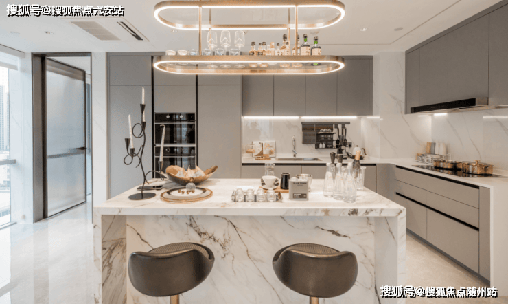 选材用料上,西投银泰城精选意大利路易斯灰大理石,地面采用整体铺贴,这在大平层中并不多见;整体软装以浅色背景为基底,极简的金属线条搭配皮质软包,多重材质碰撞,带来丰富的视觉层次,大大提升了公区的质感。