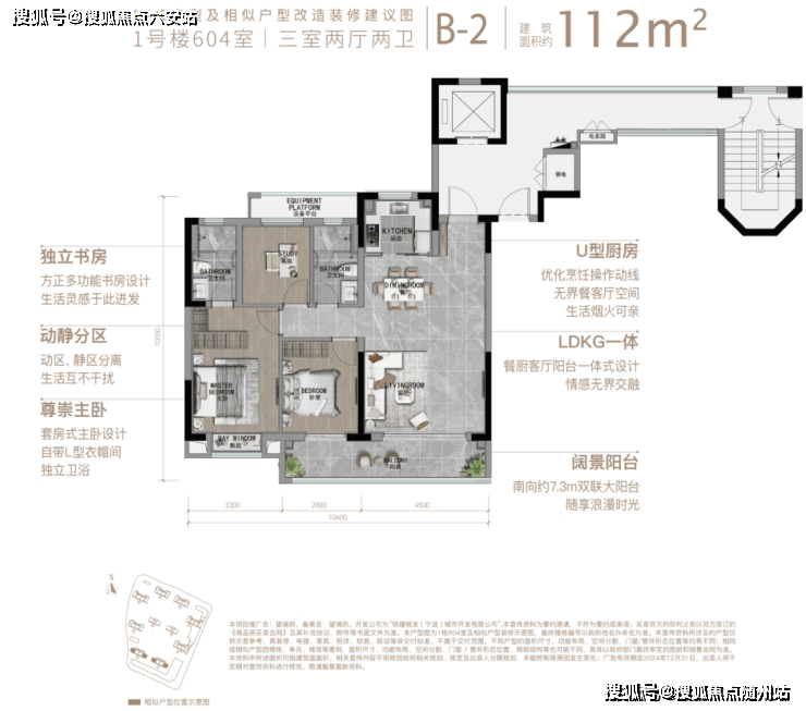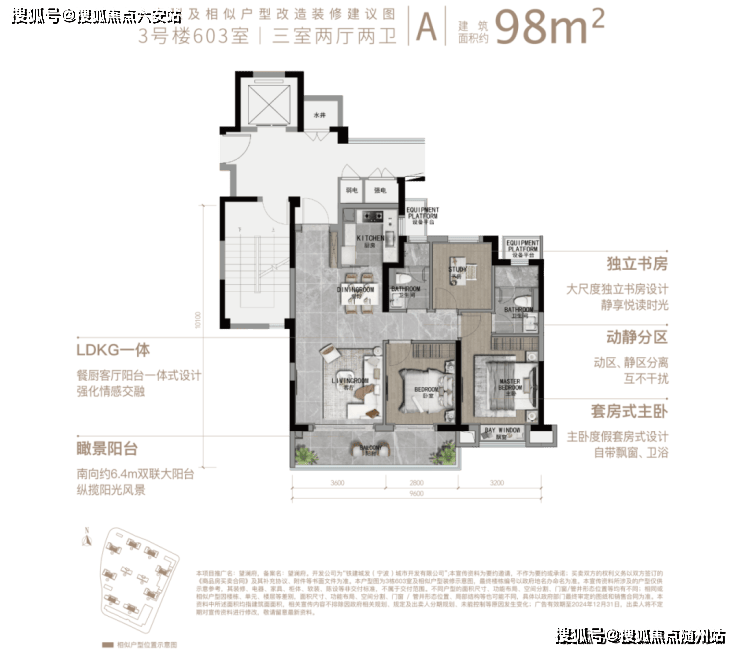 • **98㎡三房两卫**:创新LDKB一体化设计,6.4米双联阳台实现“家政+观景”功能分区,主卧套房配置270°观景飘窗,得房率高达82%;