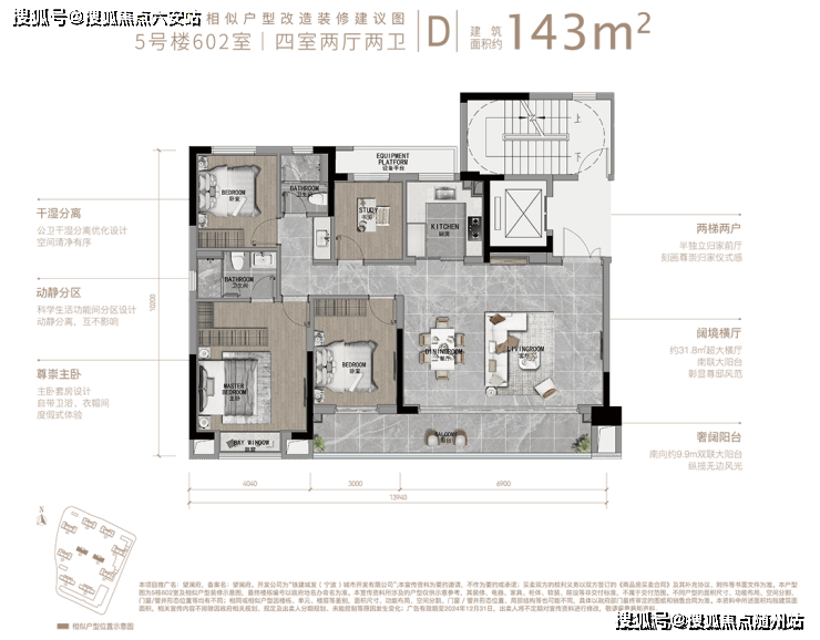 • **130㎡四房两卫**:边厅南向三开间设计,约36㎡餐客一体大方厅连接5.6米景观阳台,主卧套房配备独立家政间与观景浴缸,洋房尺度媲美大平层;