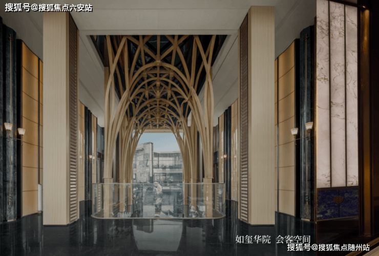 入户门厅以黑松迎宾,斗拱造型灵感源自六和塔,巧妙融合钱塘江潮涌、东方榫卯和江南园林拱门元素,营造出独特的归家仪式感。