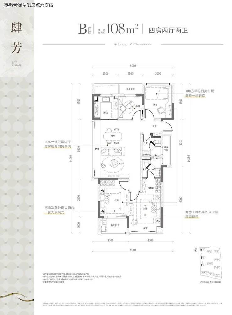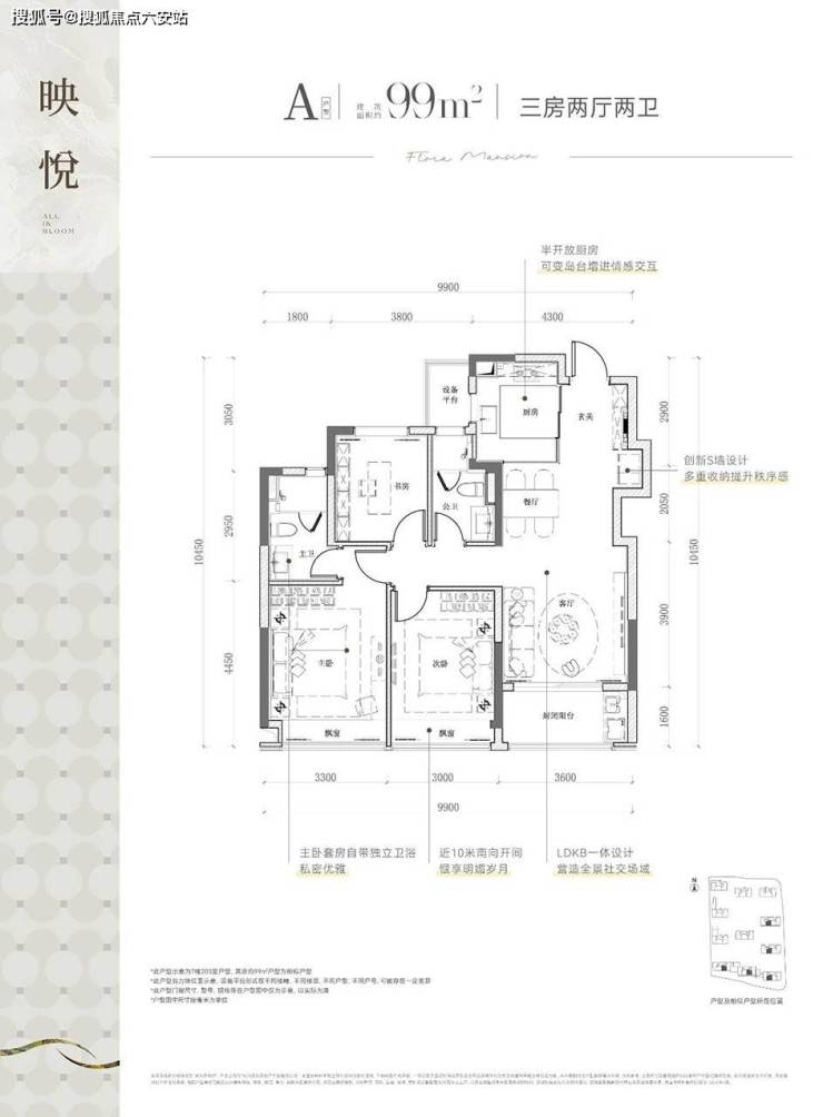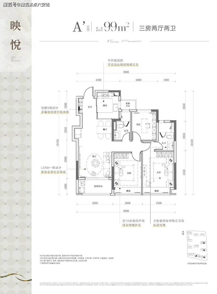 99㎡三房两卫:三开间朝南+5.4米双飘窗。