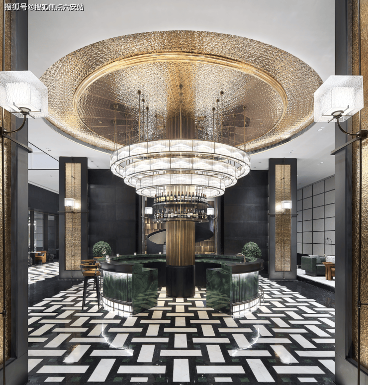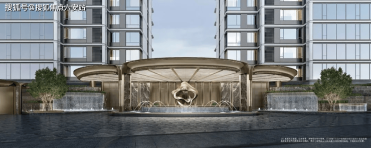 在门廊之前,绿城更是不计成本地落下四组叠瀑水景,涟漪生花;中央水景以潘多拉奢石为底;落客区的地面也采用了扇形石材铺装……