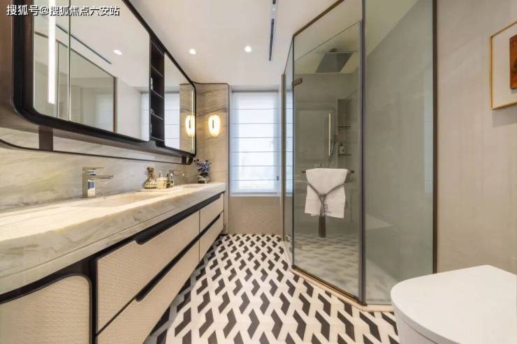 主卫更是下了血本:KA浴缸、双台盆、大理石拼花地面,还有独立的美妆冰箱,女主人看了很难不心动。