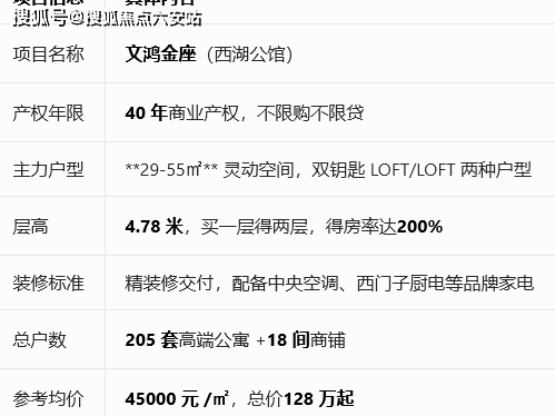 文鸿金座(又称文鸿金座・西湖公馆)是杭州西湖区黄龙 CBD 核心的现房精装公寓,主打4.78 米层高 LOFT 与双钥匙小户型,以低门槛、高回报、核心地段为主要卖点。®营销中心: VIP-Line: 400 811 3125 , ☎ 137 5083 8221﹝已认证﹞