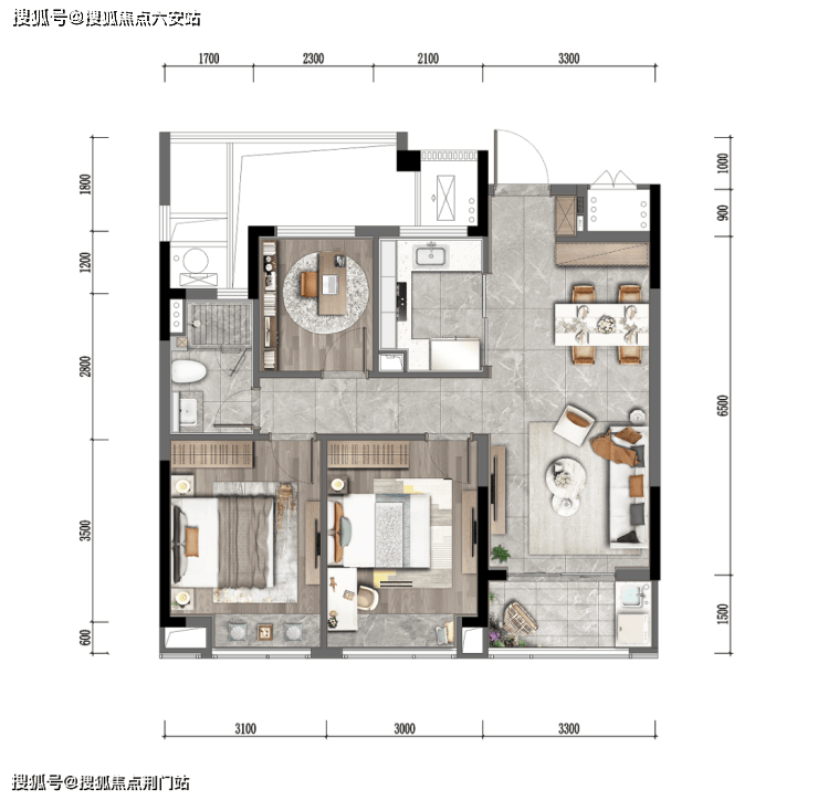 106㎡三房两卫,均为边套。边套最大的感觉就是公区非常阔绰,约6米的边厅自带飘窗,尺度感非常强。