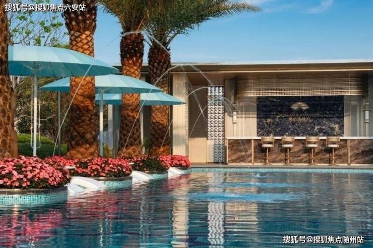 以约280㎡安缦风无界泳池与约1000㎡中央草坪为中轴,串联“一轴两带六大典藏”景观体系。泳池采用透明池壁无界设计,与草坪形成度假式休闲空间。