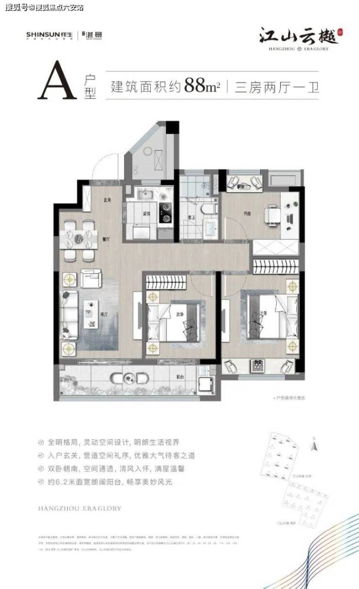 该户型,三开间朝南,南向约9.4米奢阔面宽,将充沛阳光洒落在主卧、次卧、客厅,将日常起居,从一开始,就赋予了光的特性:温暖、和煦。