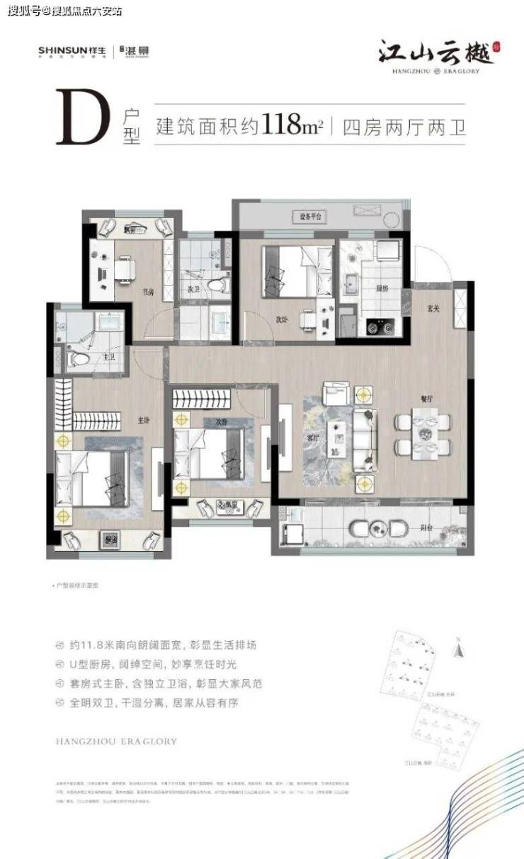 祥生湛景·江山云樾府118㎡户型,横厅南向开间约5.5m,在大多数人的印象里,这几乎是别墅产品才能有的尺度,放眼整个城东板块同样十分稀缺难得。外加双阳台景观面无缝衔接,窗外风光摇曳入内,给生活无形增添一道唯美的背景板。