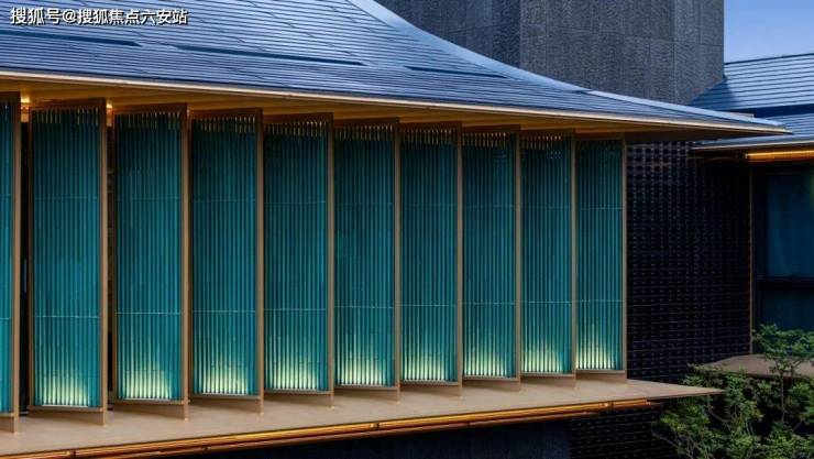 在立面打造上,提取宋代歇山顶样式,转译形成深远的挑檐,整体呈现一种清雅内敛的当代气质;大尺度巨幕玻璃窗镶嵌金色铝线条,极简化打造光影天幕,倒映自然之境;臻选靛蓝色的陶瓦,原创蓝金坡屋顶,掀起杭州合院立面的新序章。