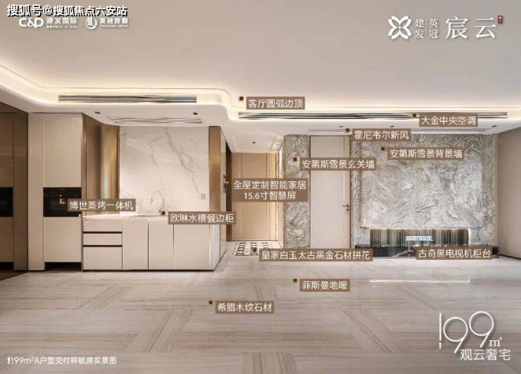 建面约199㎡户型精装风格为白金色调,选用皇家白玉、太古黑金、安第斯雪景、希腊木纹等名贵奢石,巧妙搭配在地面和墙面空间。配置大金中央空调、霍尼韦尔新风、菲斯曼地暖三大件,以及博世、方太、汉斯格雅、杜拉维特等品牌。