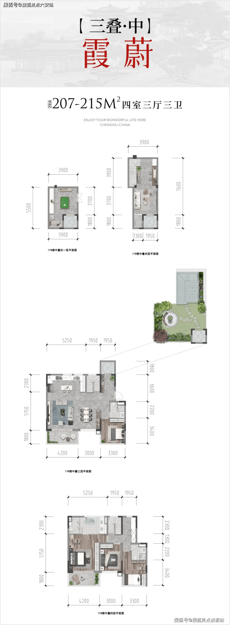户型亮点:建面约207-296㎡户型,涵盖两叠与三叠,户户朝南、独立电梯入户、私家花园私密归家动线,部分房源配备双下沉式庭院,实现“有天、有地、有院、有景”的墅居体验。