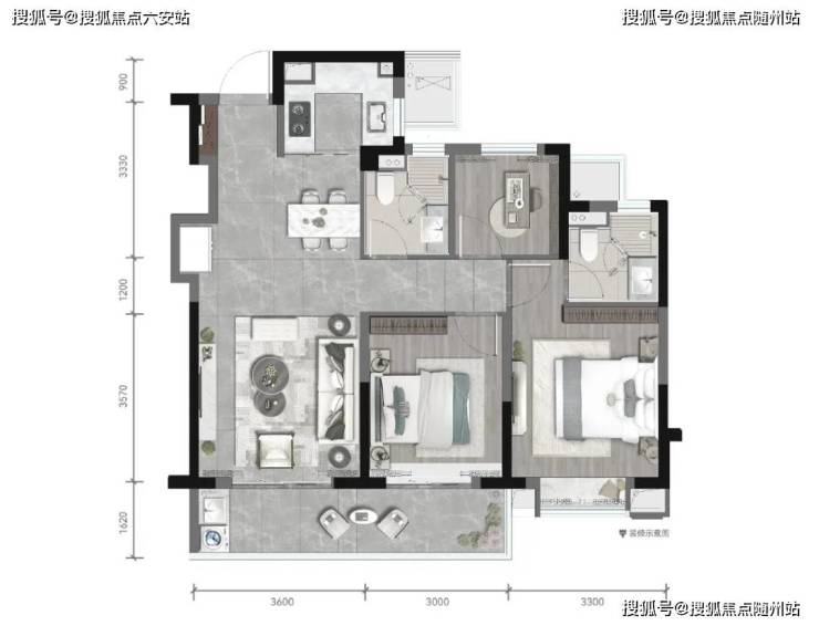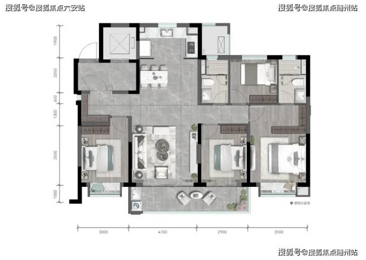 双连阳台的99㎡户型,三房+双明卫空间布局,约9.9米的南向整体面宽,把小户型的面宽尺度做到了极致,采光更佳。家庭公区采用了餐客厅一体化设计,联通U型厨房和景观大阳台,享受复合空间的多样化使用需求。
