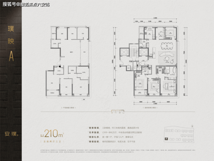 在户型设计上,安璞同样表现出众。约210㎡户型为五房三卫,其余户型均配备四卫,并实现三间套房布局,极大提升了居住的私密性与舒适度。