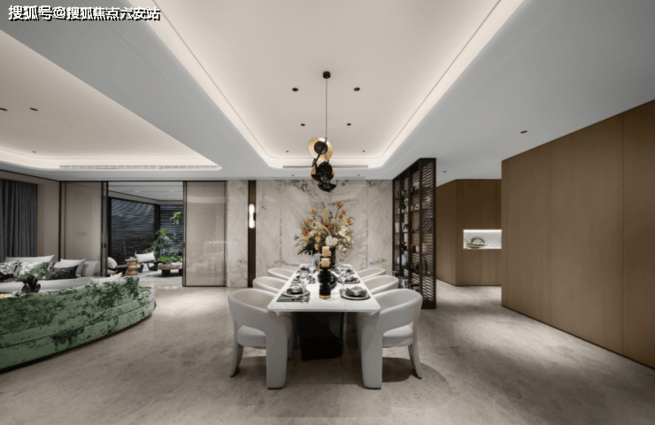 基于LDKB的布局,家人们共享整个空间,生活中的交互或社交时的沟通都可以轻松展开。餐厅背景奢石结合玄关金属隔断柜,一体化的形式下更添品质属性。