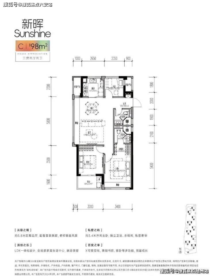 然后是非常难得的98㎡边套户型,同样是三房设计,空间却更加舒适,约5.8米的边厅加飘窗,小户型的餐厅客憋屈感一下子消解了,还增加了不少拓展空间。