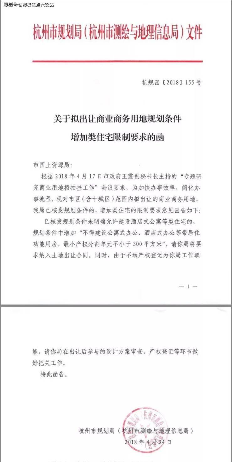 2018年4月24日,杭州市规划局再次发布《关于拟出让商业商务用地规划条件增加类住宅限制要求的函》,文件明确“对杭州市区(含十区)范围内拟出让的商业商务地块,增加类住宅的限制要求。”