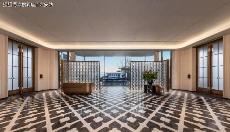 公区配置:仿大理石岩板地面、金属蚀刻屏风、超横屏归家门厅(宽43米)