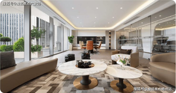 洽谈区则以「游艇式海上会所」的调性打造,整面向外打开,形成超大环形景观面,旁边还配置高端水吧,绿植则选取了柳叶百合竹,整个空间随性自由,让人没有拘束感。