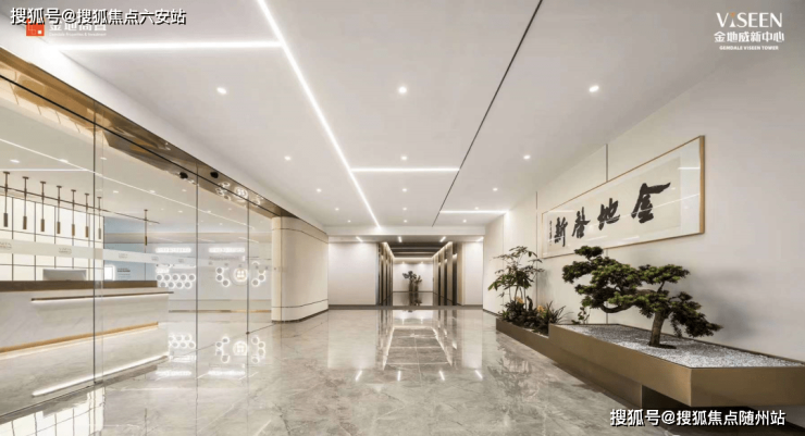 乘电梯至4F国际接待中心,金地威新中心的未来真实办公场景跃然眼前。整个接待中心以弧形元素和香槟色调贯穿,入口处设计「金地启新」主题造景,甄选罗汉松、发财树、兰花,传递“恭迎贵客、财源广进”的美好寓意。