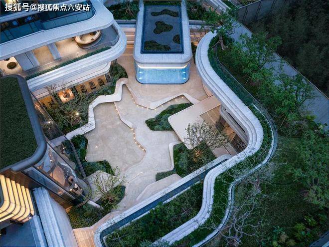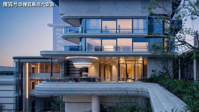 因项目整体抬高,从下沉庭院到架空层“空中花园”的落差极大,形成独特的峡谷地貌,杭序府的设计团队汲取九溪烟树为造园灵感,打造一个立体多维的城市溪谷交互园林;因项目毗邻江岸,杭序府的外立面以“站立的江潮”为灵感,大面积弧形玻璃与四层堆叠的石材线条,将钱塘江潮的千钧之力和流水之韵凝练于建筑肌理之中。