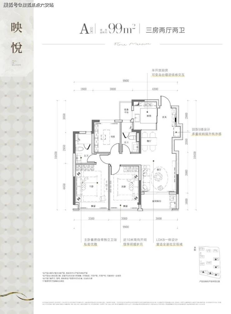 该边套户型,不仅有270度的采光视野,主/次/客卧三大开间并立朝南,“含阳光量”十足。