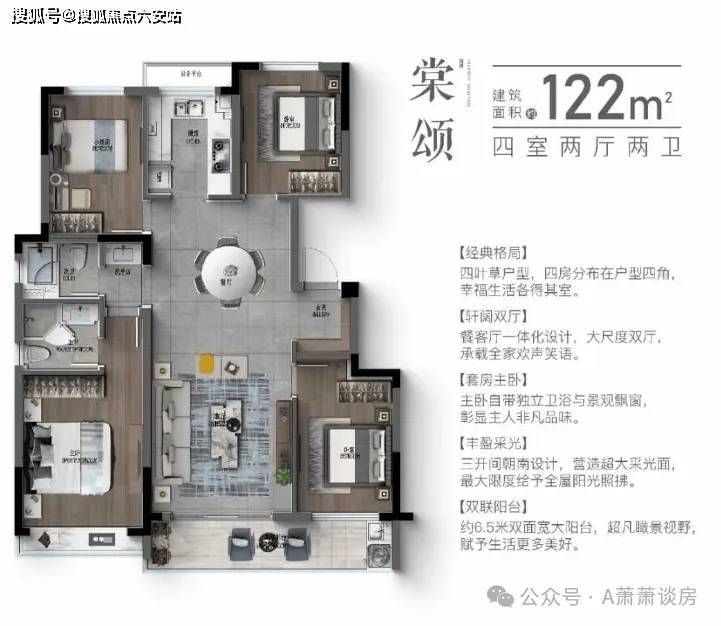 :此户型是项目的一大亮点。创新的“三房朝南”设计,最大化了南向采光面,让主要居住空间充满阳光,极大提升了居住的舒适度和健康度,特别适合注重光照的家庭。