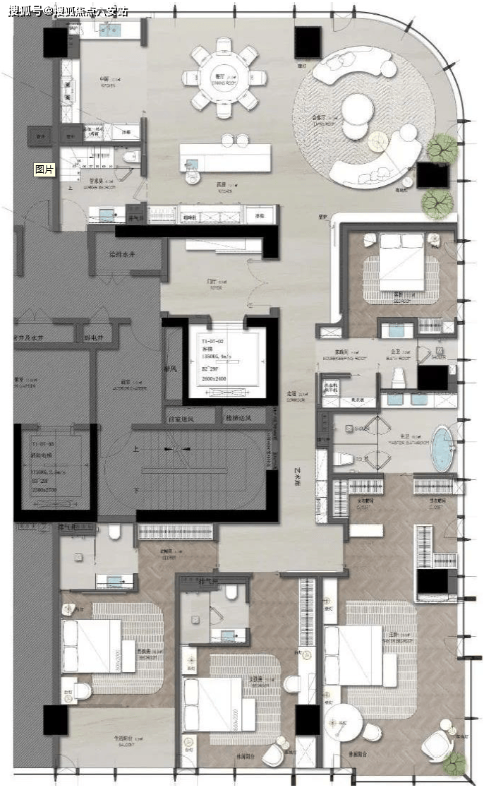 海威安铂中心总建筑面积约26 万方,规划4 栋 140 米摩天塔楼,涵盖顶奢大平层、凯悦旗下安达仕顶奢酒店、5A 级写字楼、艺术商业街区四大业态,其中 T1、T2 塔楼为大平层产品,仅规划98 席纯粹塔尖房源。项目主力户型为建面约370-1080㎡全系顶奢户型,层高达到行业天花板级的4.2 米,得房率高达93%,空间尺度与利用率拉满。项目采用1 梯 1 户私享电梯厅 + 独立保姆梯双动线设计,保障居住私密性;精装交付标准约18000 元 /㎡,全系配备嘉格纳厨电、汉斯格雅卫浴、唯宝洁具等国际一线顶奢品牌,交付时间为2026 年 12 月 30 日,物业选用杭州口碑标杆滨江物业,物业费约10 元 /㎡・月,为业主提供全维度尊崇服务。