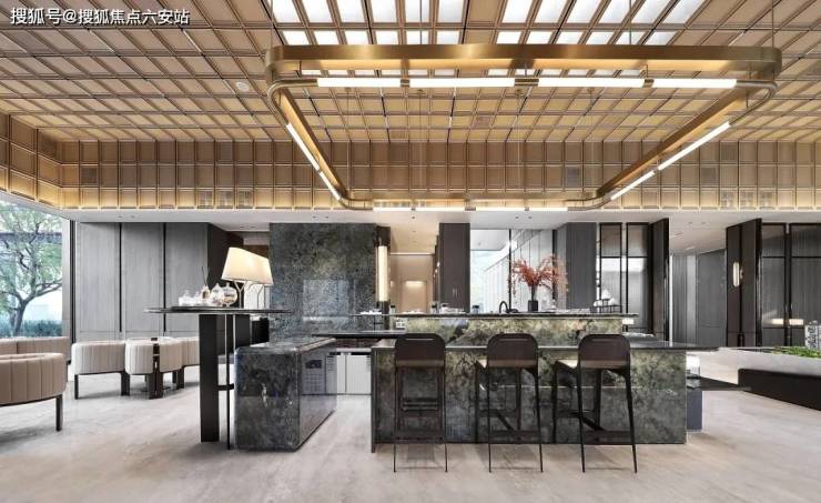 为满足当代消费者更关注的情绪价值,保利发展控股让项目的场景力充分演变成了产品力,在宁波汀澜瑧悦的六重瑧境之外,处处皆是充满烟火气的放空自留地。比如开放式吧台区域一进前院,吧台与厅堂之间围合成“留白”式的离散空间,有更多现代生活场景形成的可能性。光从吧台缝隙中穿透过来,这样一种近乎虚无的元素,和一种以金属质地极其强化的元素,产生了戏剧性的碰撞。