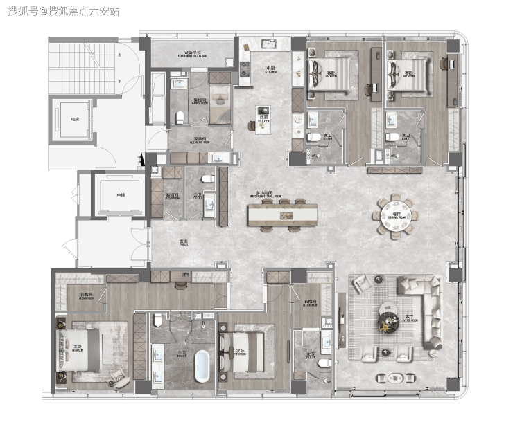 建面约410㎡“湾潮”户型:由WSD上海世尊团队以“摩登东方”为设计语言打造。LDK一体化方厅面积达109㎡,衔接50米U型跑道阳台,提供270°环幕视野。主卧套房配置双衣帽间及观景浴缸,还设计了法式艺术走廊,将东方雅韵与现代生活需求完美平衡。