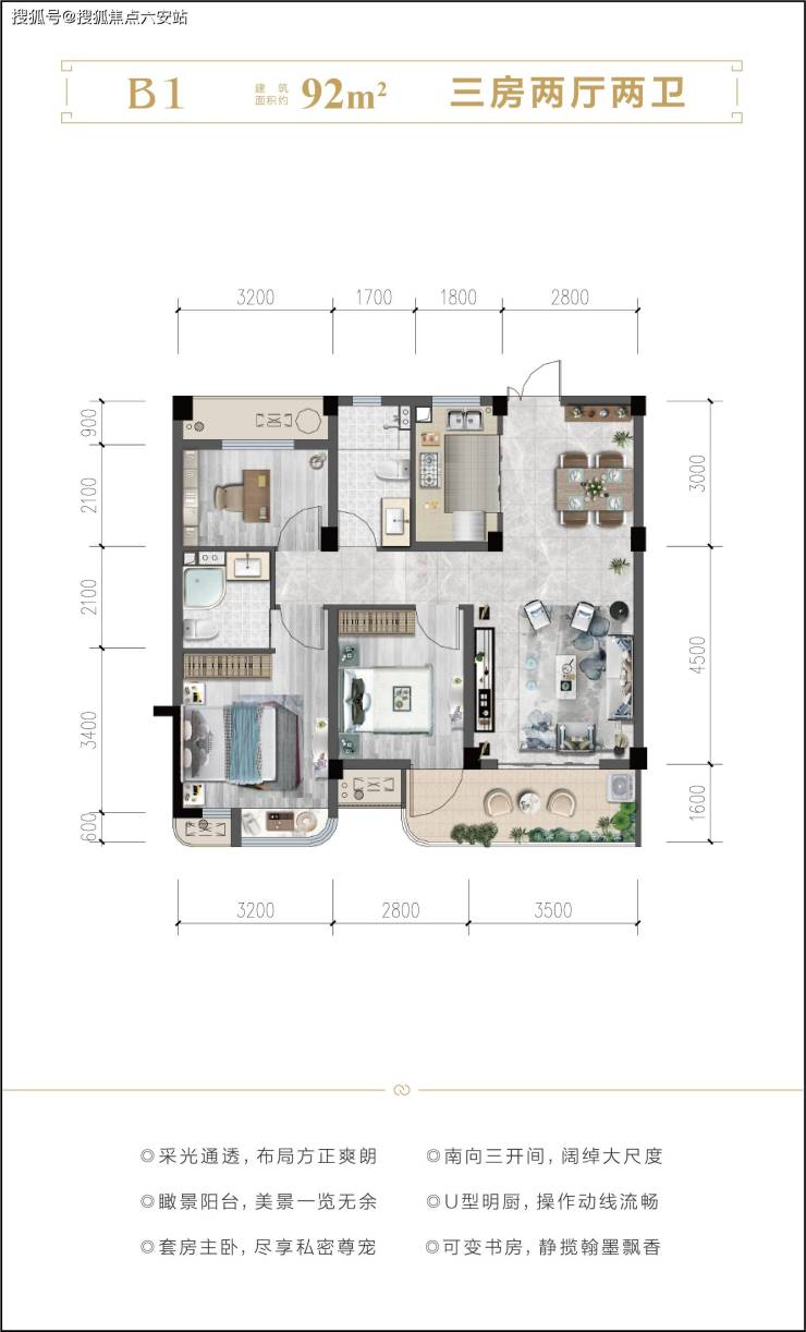 90㎡三房两卫:三开间朝南+6.7米双阳台,层高3米超竞品;圆弧转角观景窗+铝板精装大堂,刚需价享叠墅级体验。