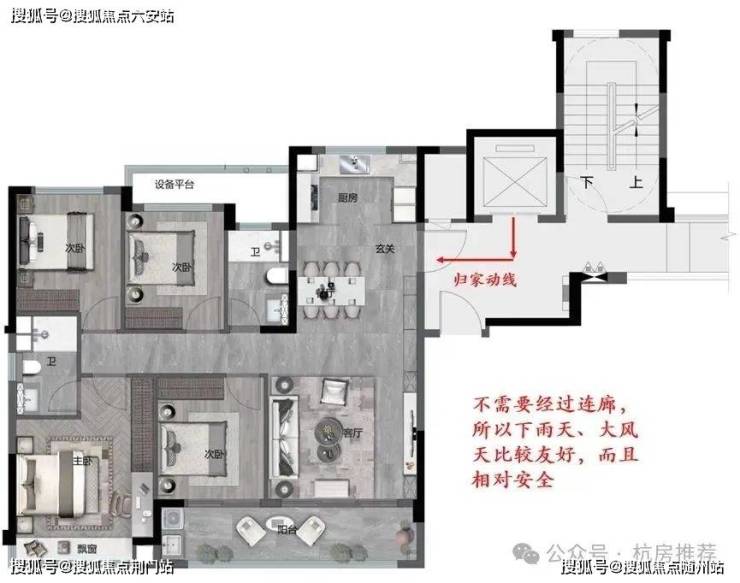 由于电梯的分开设置,连廊设置于中间,所以边套回家的时候不用经过连廊(见下图)。那么下雨天、大风天的时候就比较友好,也相对安全。