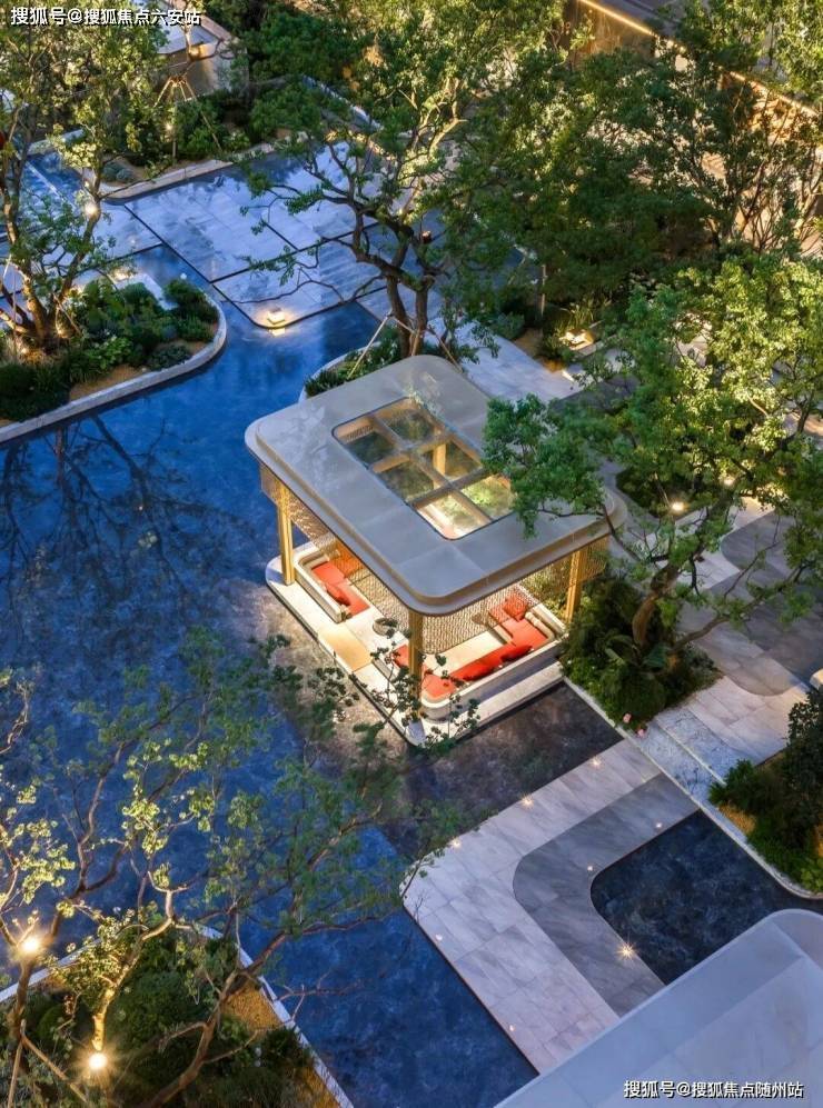 站立于台地之上,知海棠水景沿土地形态形成瀑布、镜面、溪涧等多重形态,浮岛客厅处设置休憩卡座,与前厅形成光影对话,如同三潭印月一般,映于湖心之上,抬高的湖心亭设计,成为舒展园区的一道风景线。